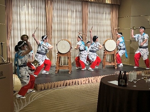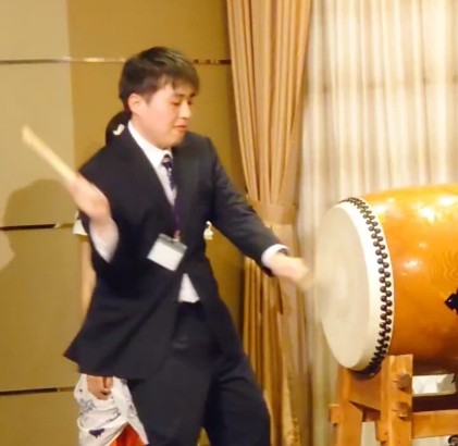 学会1日目終了後,リーガロイヤルホテル小倉にて懇親会が開催され、他大学の学生や非破壊検査事業に携わっていらっしゃる企業の方々とお話しすることができ,1日を通して知見を深めることができました.懇親会の途中には国指定無形民俗文化財である「小倉祇園太鼓」の演奏団体である魚町三丁目の方々による演奏披露が実施され,そのあとに太鼓に触れる機会が設けられ実際に体験させていただきました.魚町三丁目の方々の気迫あふれる太鼓の演奏に感動するとともに,歴史ある文化財に実際に触れる機会をいただきとても充実した時間となりました.