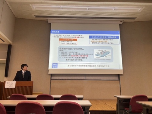 自身4回目であり,これまで取り組んできた研究活動の集大成となる最後の学会発表の場でした.発表中や質疑応答では自信を持って自分の意見を伝えることができ,機械材料強度学研究室に所属した3年間の成長を感じることができました.また,本学会は溶接分野の学会ということもあり,これまでとは異なる視点や新たな視点から自身の研究を見直す良い機会にもなりました.修了までわずかですが,この経験を活かして残りの研究活動に精力的に取り組んでいきたいと思います.